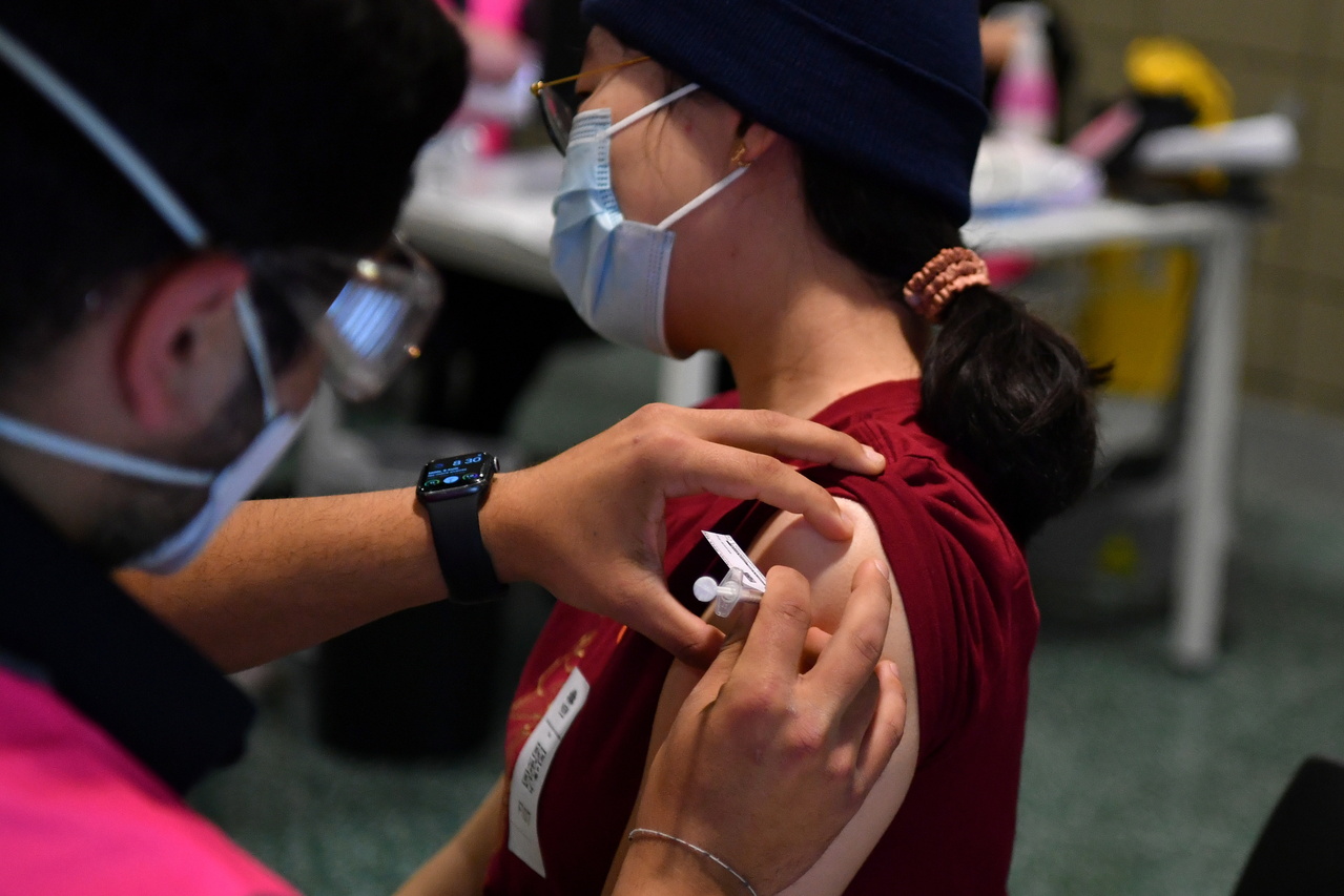 A student receives a Pfizer Covid-19 vaccine dose at a mass vaccination hub at Sydney Olympic Park, on Aug 9, 2021.