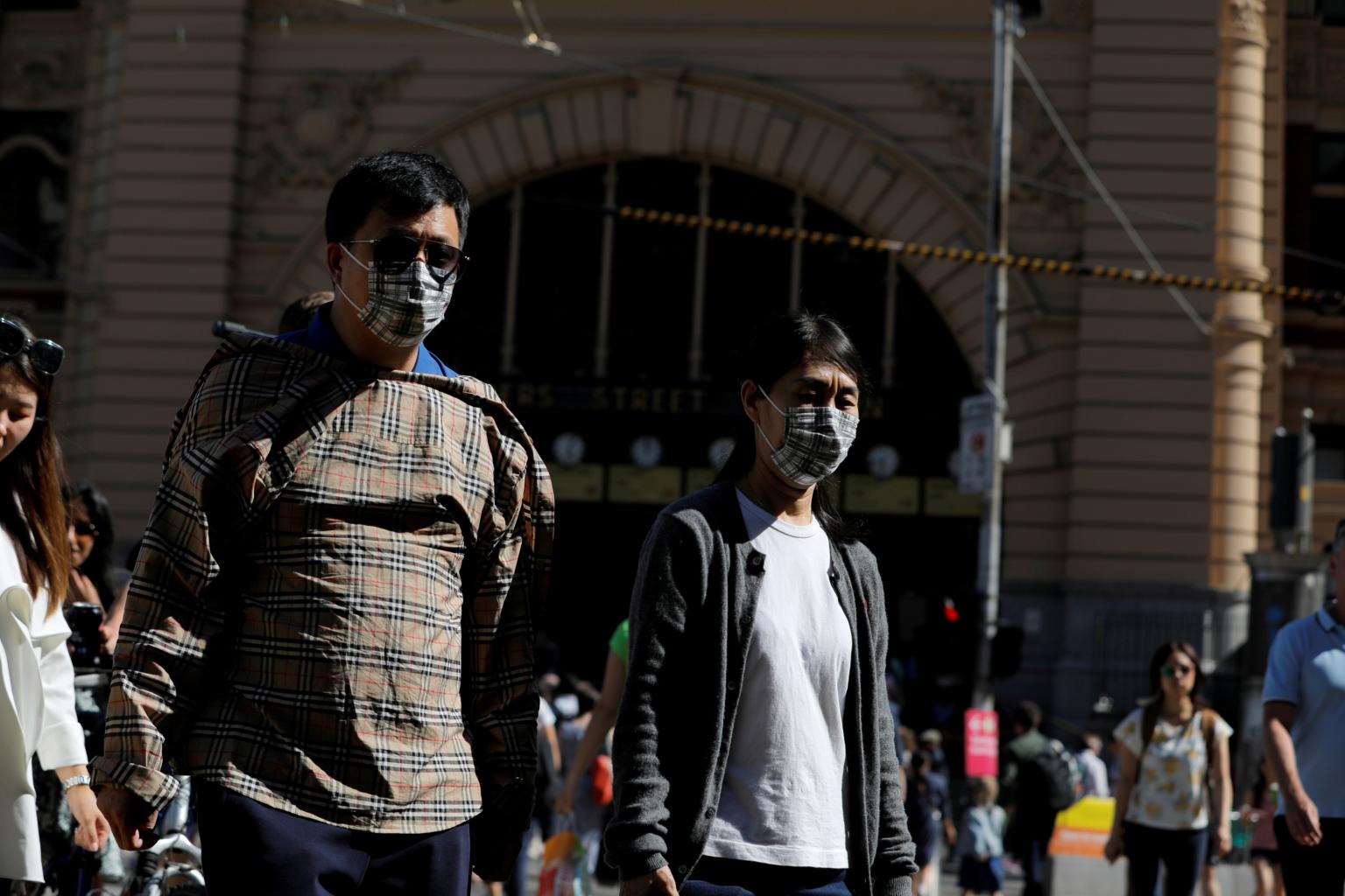 People wearing face masks walk by Flinders Street Station after cases of the coronavirus were confirmed in Melbourne, Australia, on Jan 29, 2020.