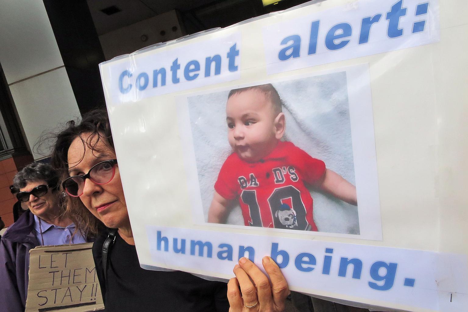 A woman holds up a placard at a protest outside an immigration office in Sydney on Feb 4, 2016.