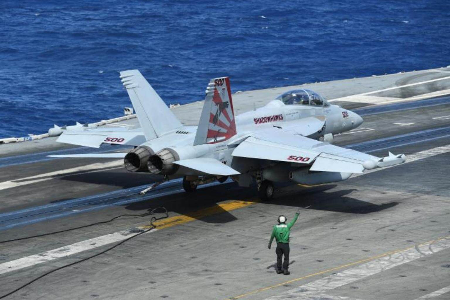 An F/A-18F Super Hornet releases the arresting cable after landing on-board the USS Ronald Reagan in the Coral Sea, on July 20, 2017.