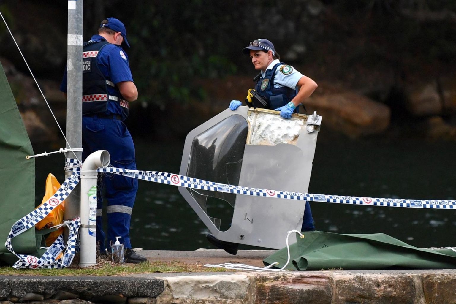 An Australian policewoman holds a piece of debris from the seaplane that crashed on the Hawkesbury River some 50km north of Sydney on Dec 31, 2017.