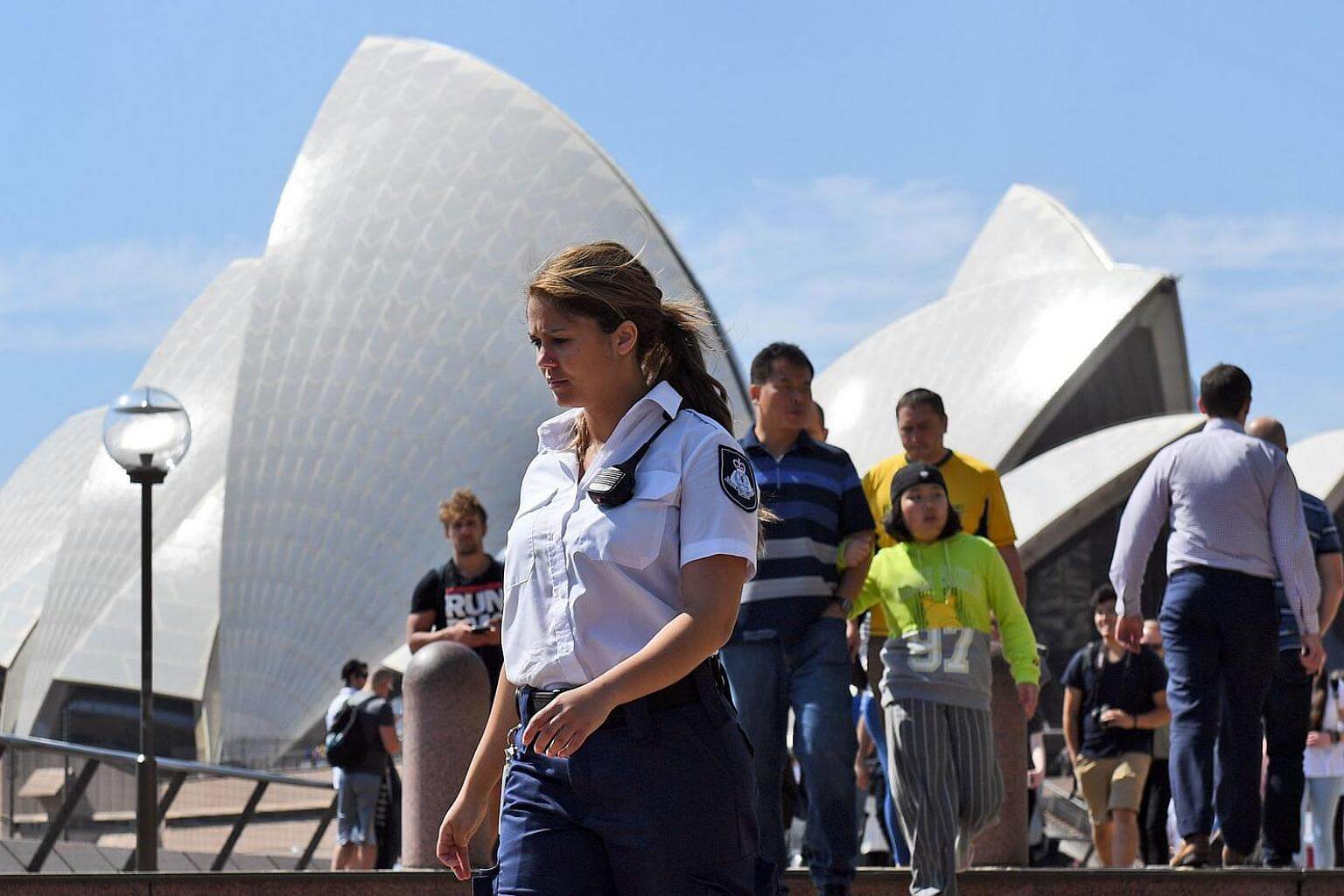 A security guard patrols the forecourt of the Sydney Opera House on Sept 9, 2016, after an 18-year-old man was charged after allegedly making threats at the Sydney Opera House.