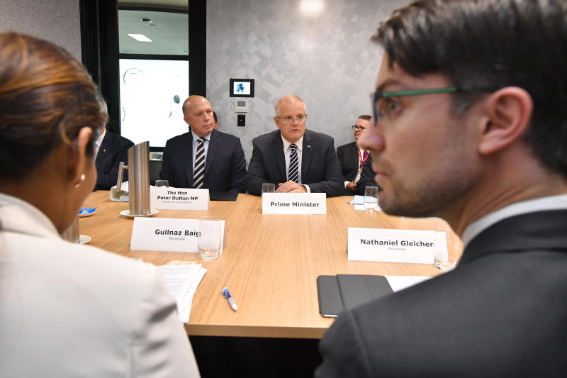 Australian Prime Minister Scott Morrison and Australian Minister for Home Affairs Peter Dutton meet social media executives at the Waterfront Place in Brisbane on March 26, 2019.