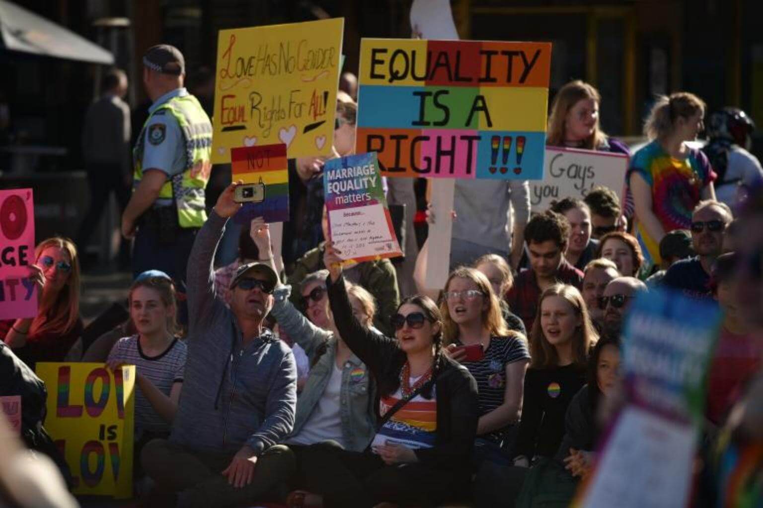 Supporters of same sex marriage carry banners and shout slogans as they gather on a street in Sydney on Aug 6, 2017.