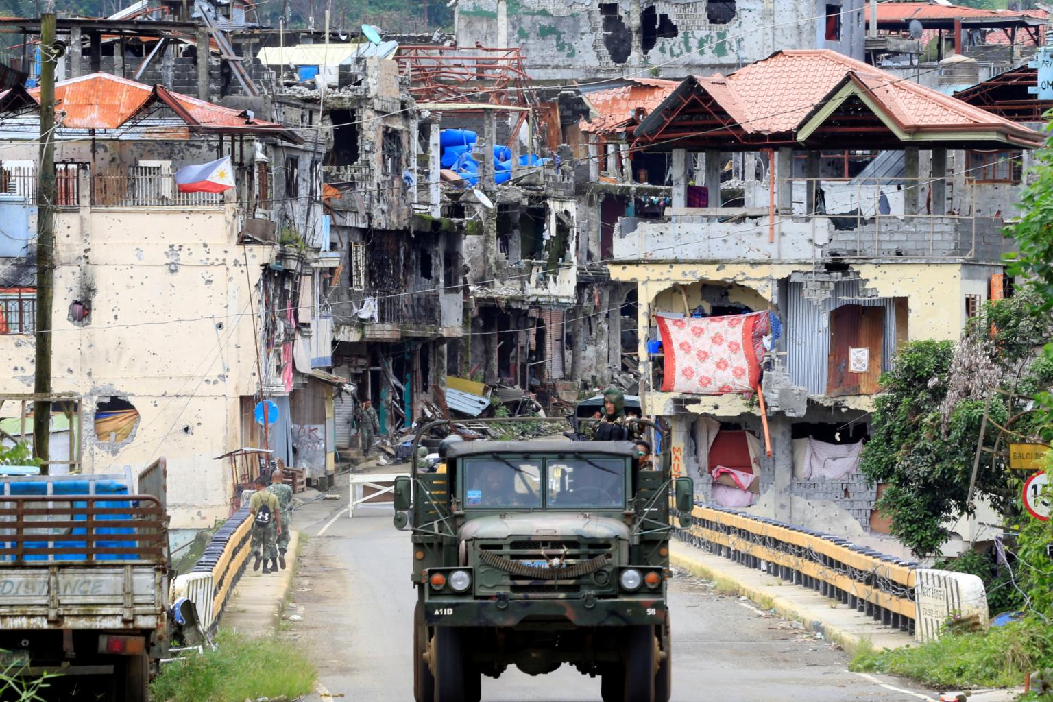 Soldiers on a military truck drive past houses and buildings damaged after government troops cleared the area from pro-Islamic State militant groups inside the war-torn Marawi city.