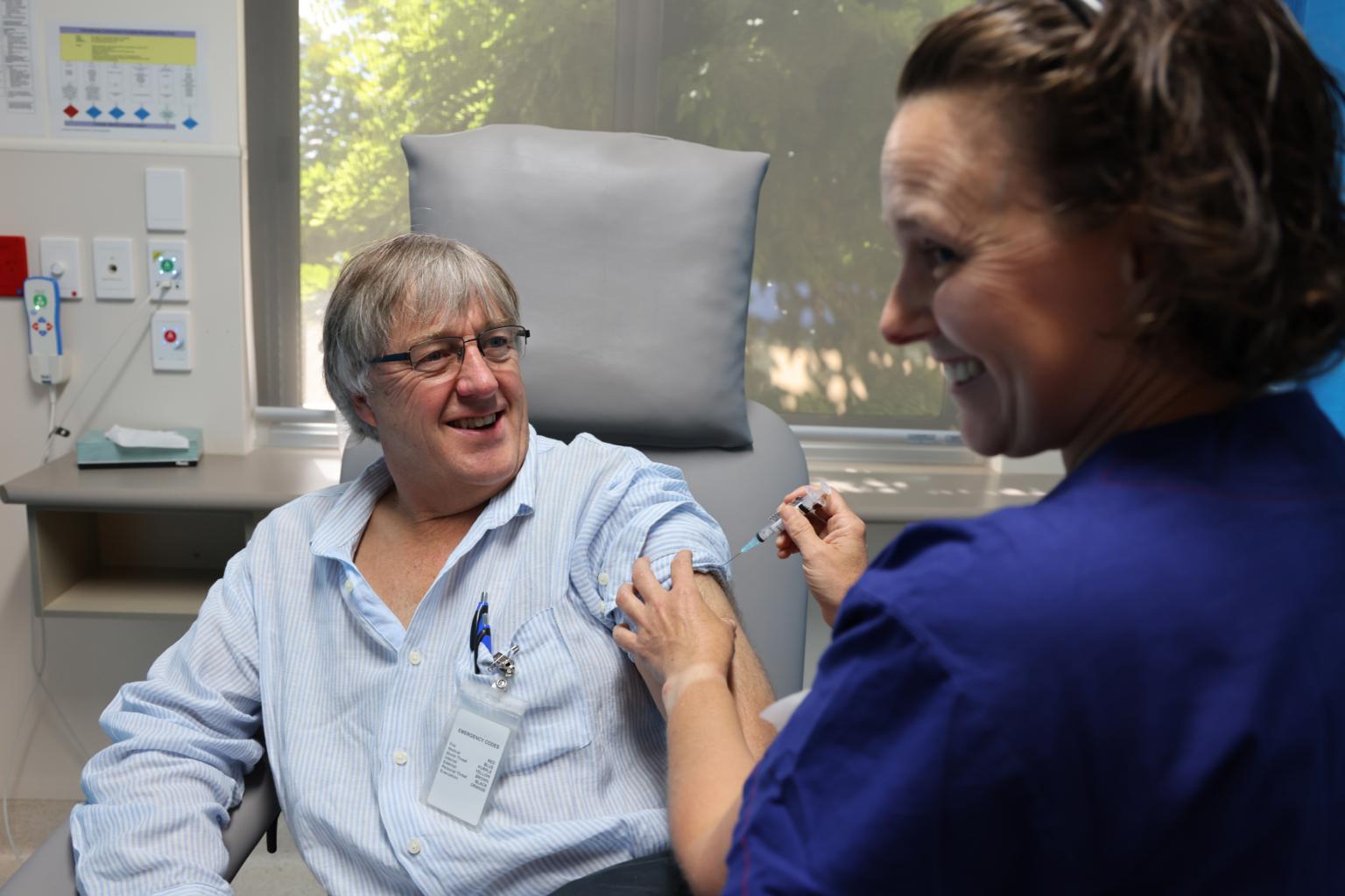 Dr Peter Rischbieth is given the AstraZeneca Covid-19 jab at Murray Bridge Hospital, Adelaide, on March 5, 2021.
