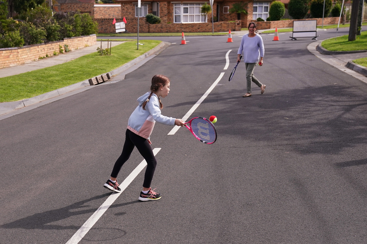 A mother and daughter play tennis in a street during a break from online schooling at home in Melbourne, Australia, on April 15, 2020.