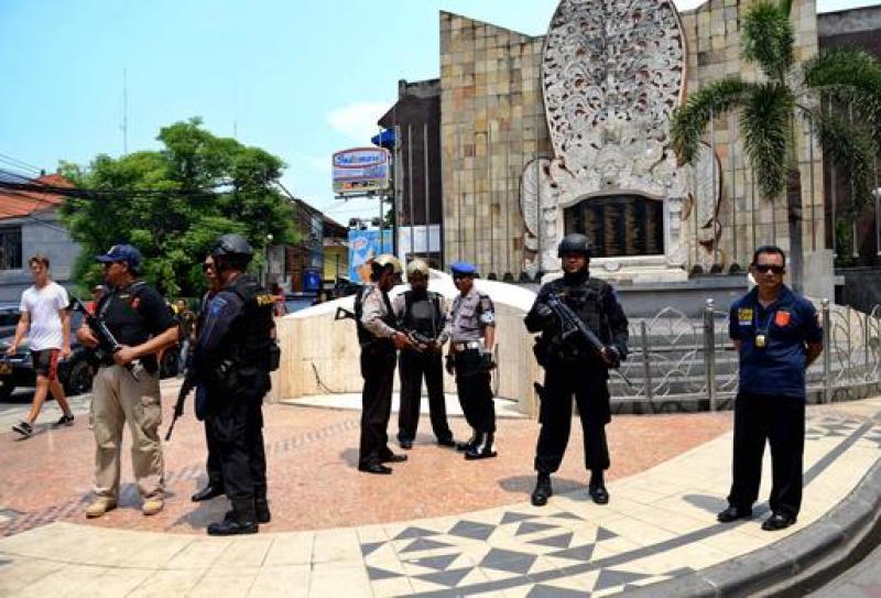Indonesia police stand in front of the monument dedicated to those killed in the 2002 Bali bombing in the tourist district of Kuta on Jan 22, 2016.