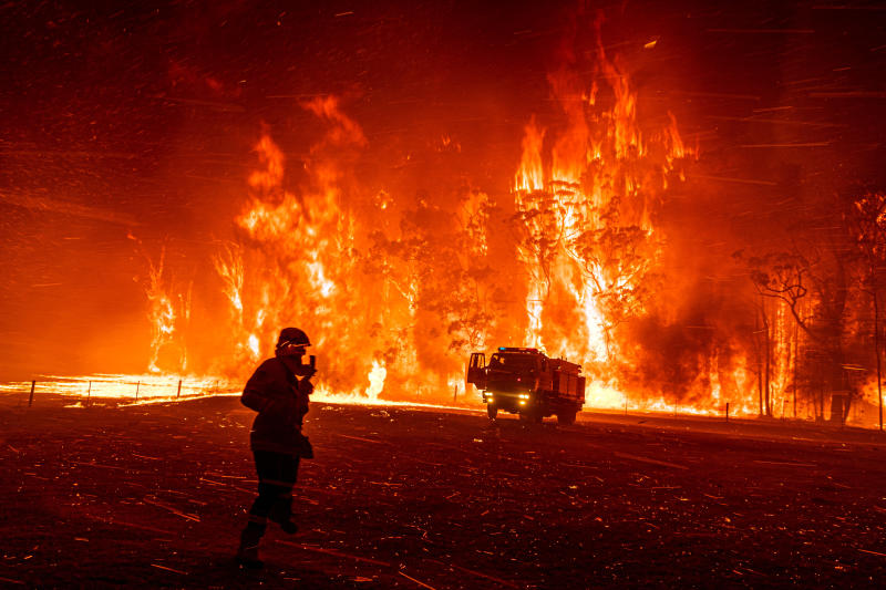 A firefighter records video on his phone of a wall of flames in Orangeville, Australia, on Dec 5, 2019.