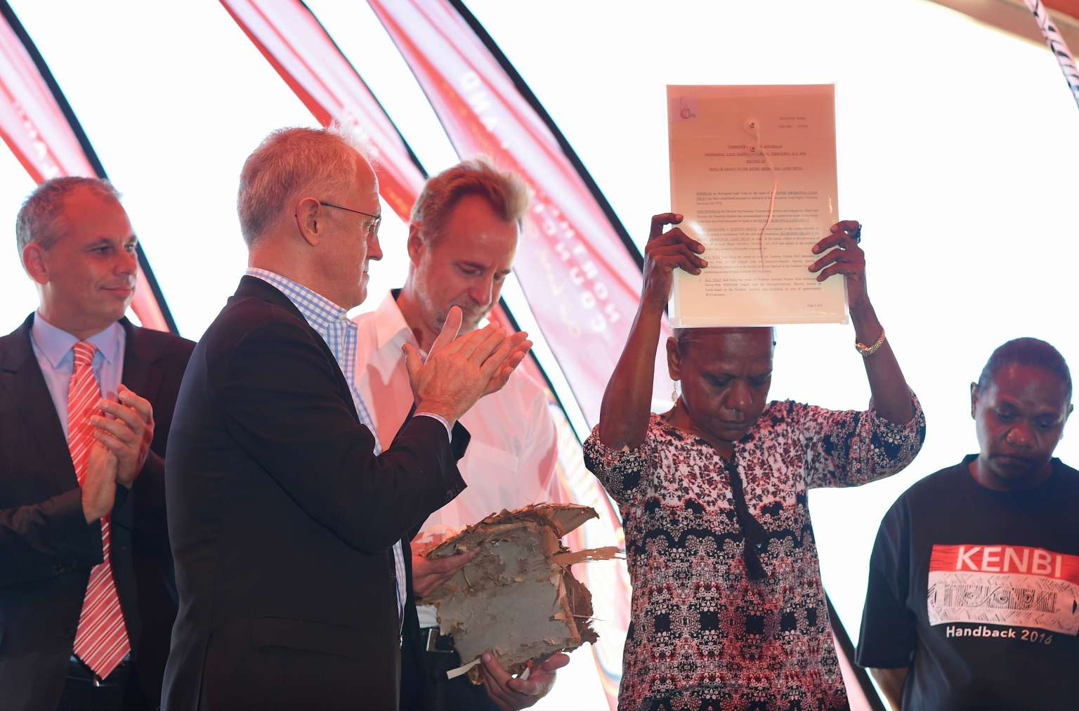 Australian Prime Minister Malcolm Turnbull reacts as a traditional owners representative holds up the land deed at the Kenbi Native land claim ceremony near Darwin, Australia, on June 21, 2016.