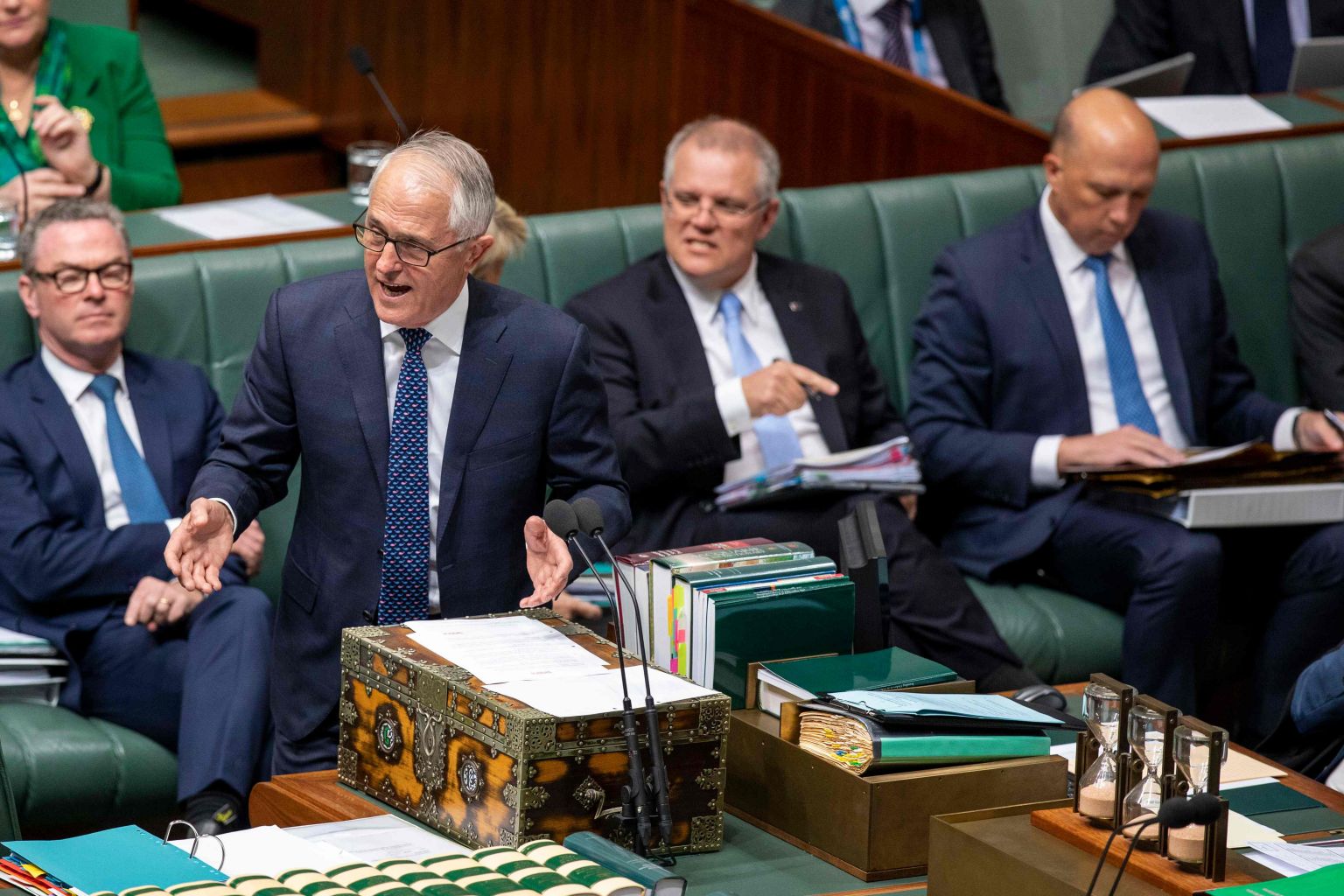 Australia's Prime Minister Malcolm Turnbull (second, left) answers a question from the opposition in Parliament as Treasurer Scott Morrison (second, right) and Minister for Home Affairs Peter Dutton (right) look on in Canberra, on Aug 20, 2018.