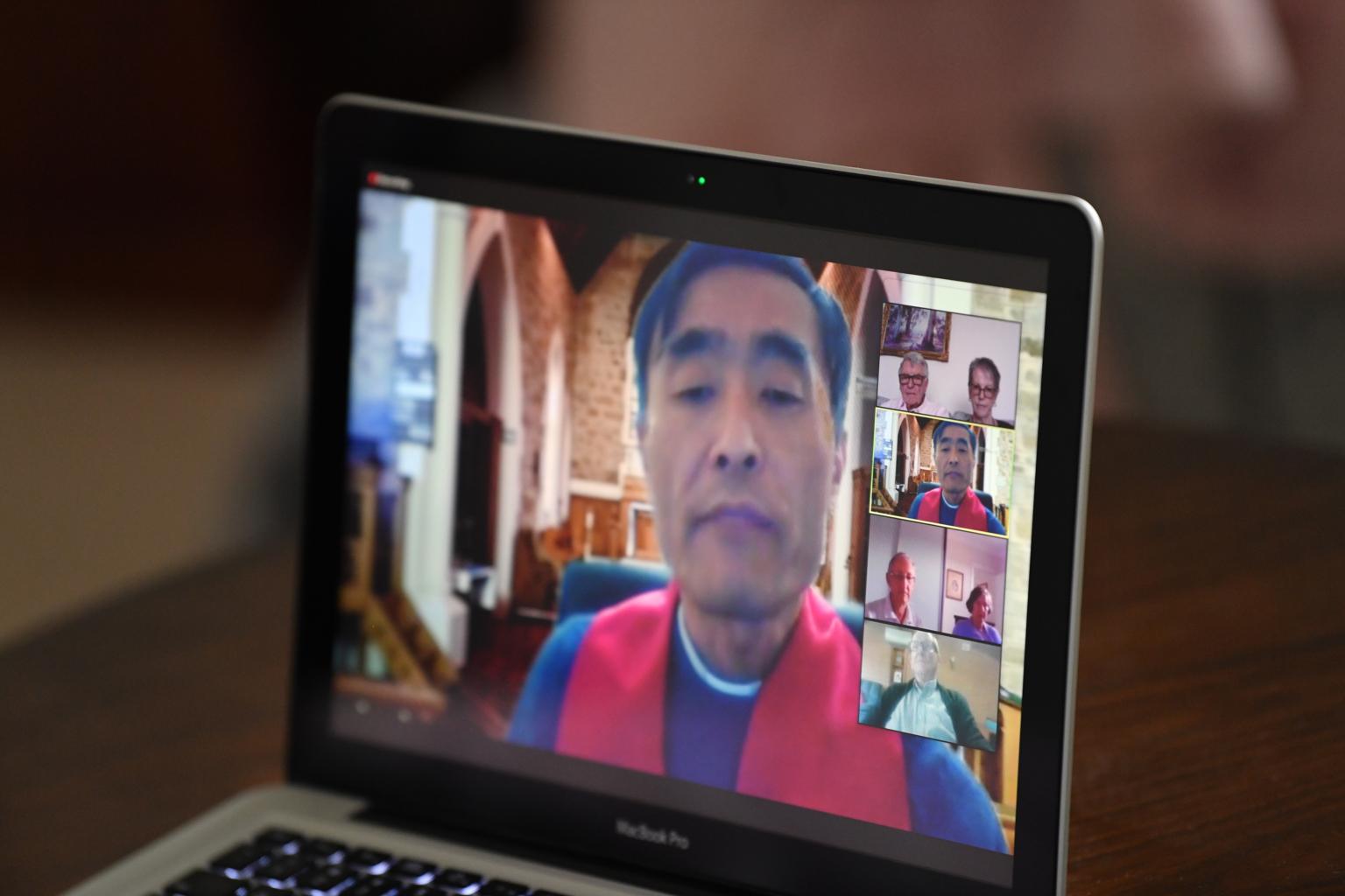 Anglican priest Zinkoo Han leads a Good Friday Mass via web broadcast in Adelaide on April 10, 2020.