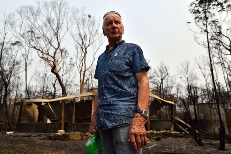 Environmentalist Ken Stewart seen in front of his burnt house recalling his escape from the bush fire in New South Wales, Australia, on Jan 15, 2020.