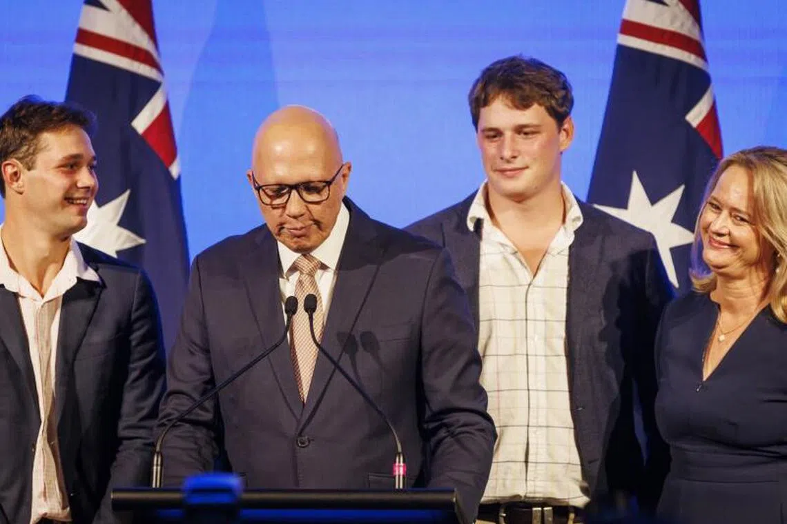 Australia's opposition leader Peter Dutton delivers his concession speech while surrounded by his family at the Liberal-National Coalition election night event in Brisbane, Australia.