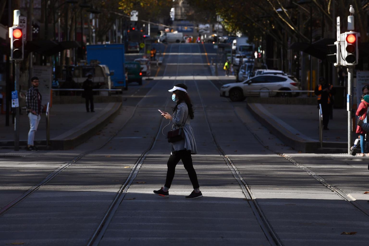 A woman crosses a street in Melbourne's central business district on June 17, 2020.