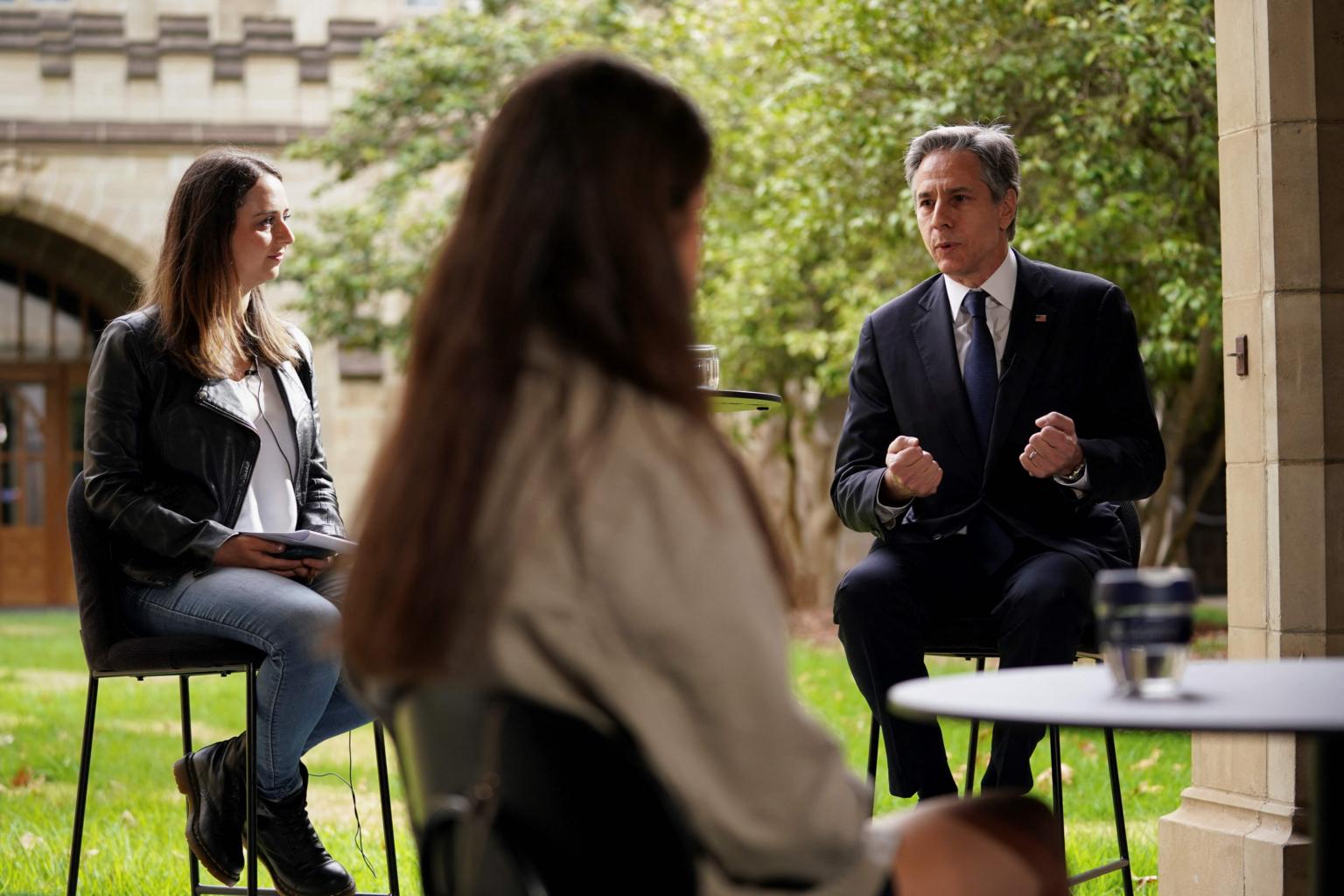US Secretary of State Anthony Blinken (right) addressing students at the University of Melbourne on Feb 10, 2022.