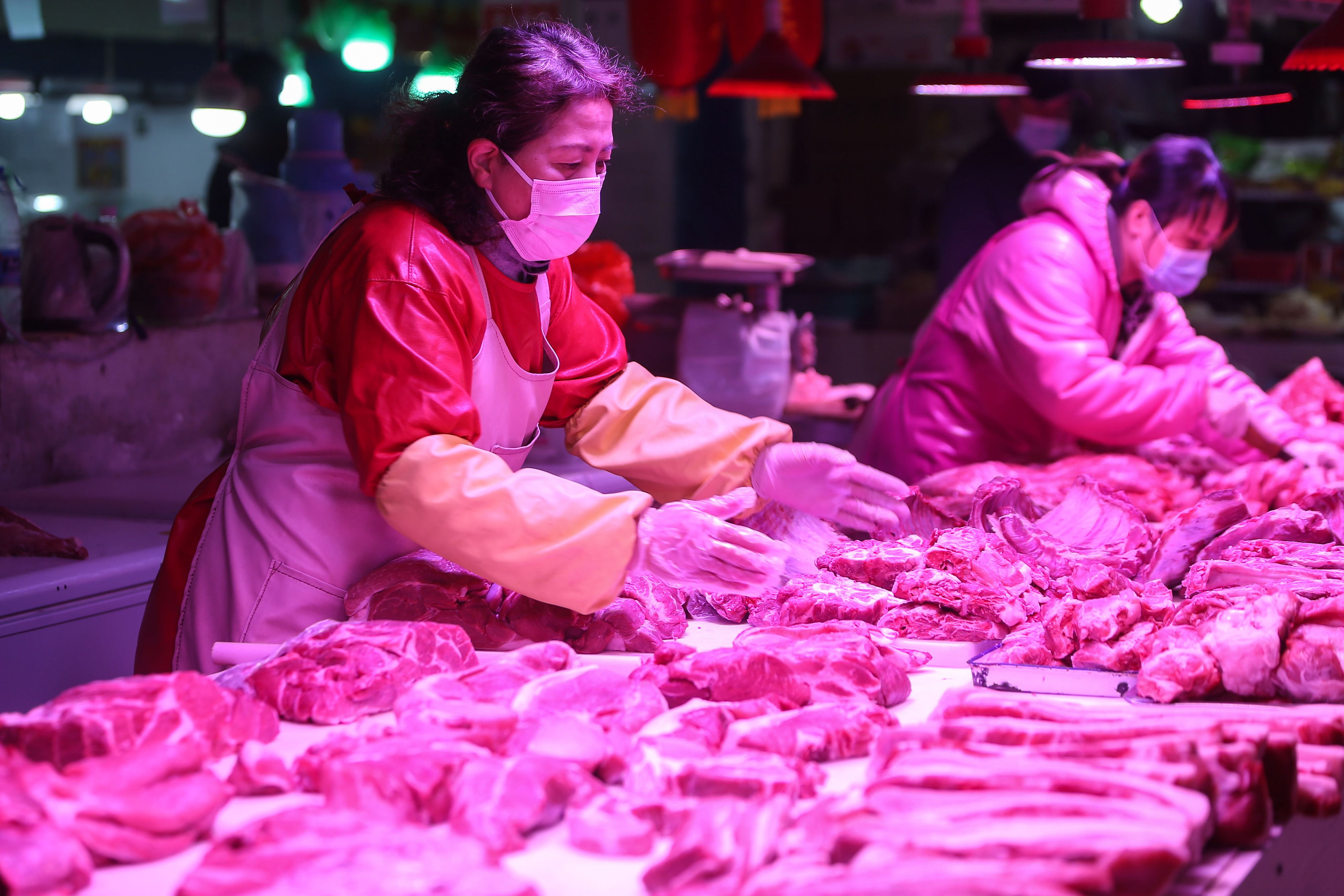 A vendor waits for customers at a meat stall in a market in Shenyang on April 10, 2020.