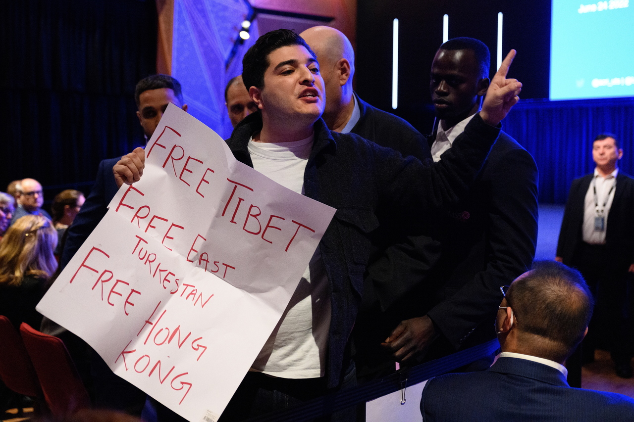 Security officers removing political activist Drew Pavlou during an address by Chinese Ambassador to Australia Xiao Qian, in Sydney, Australia, on June 24, 2022.