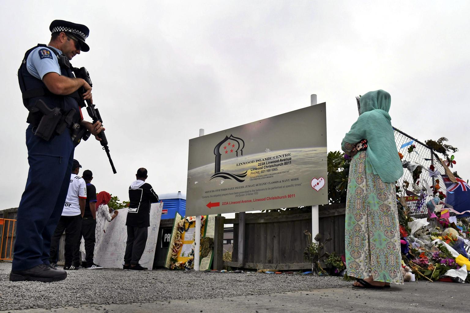 A policeman stands guard outside the Linwood Islamic Centre in New Zealand, which remains closed following the fatal shooting of 51 Muslim worshippers on March 15.