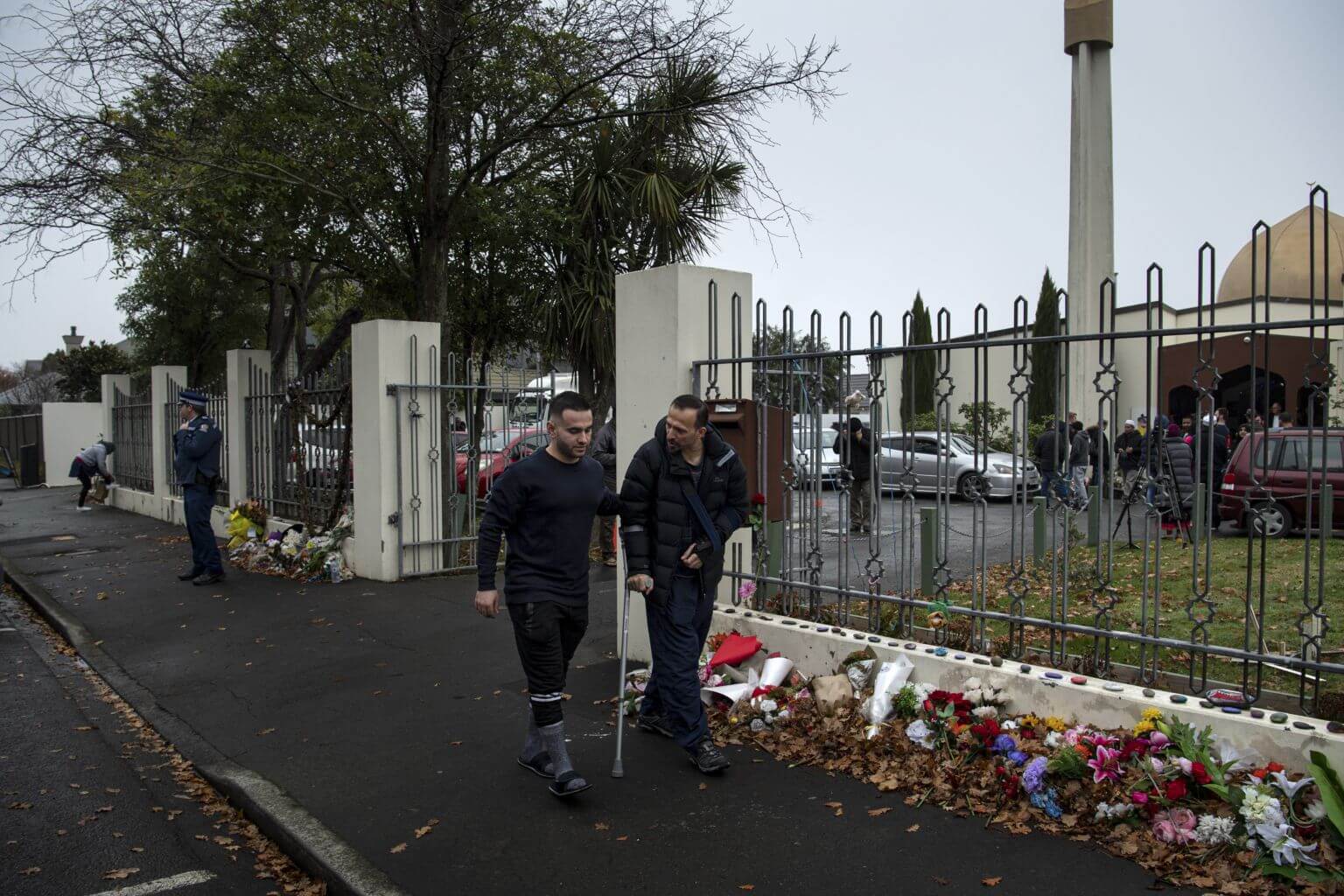 Temel Atacocugu (right) outside Al Noor mosque in Christchurch, New Zealand, where he was shot nine times in March.