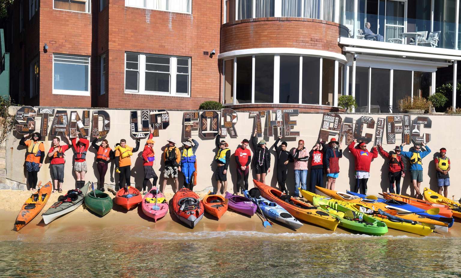 A group of kayakers hold up letters spelling out "Stand up for the Pacific" to protest against what they say is government inaction on global warming, in Sydney on June 25, 2016.