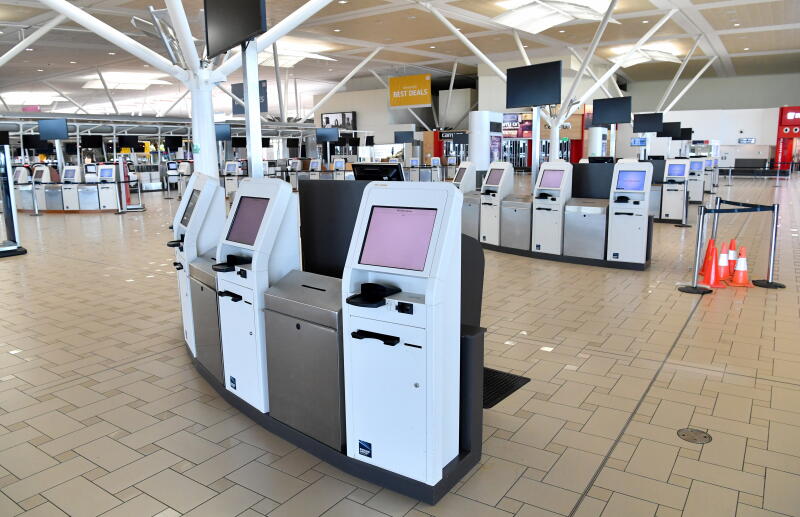 Empty check-in counters at the international airport in Brisbane, on April 17, 2020.