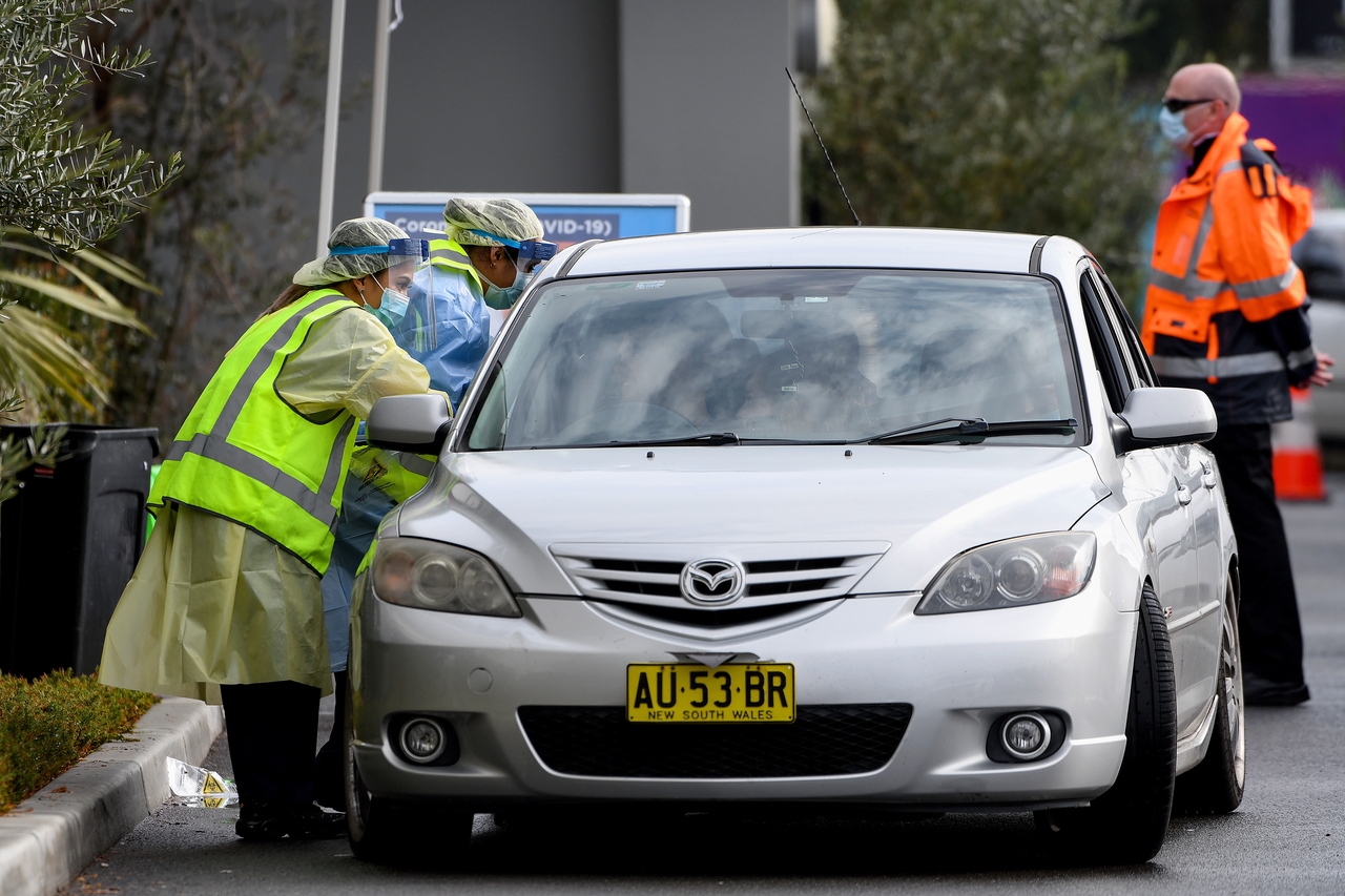 New South Wales Health workers administer Covid-19 tests to people in their cars at the Crossroads Hotel testing centre in Sydney, Australia, on July 11, 2020.