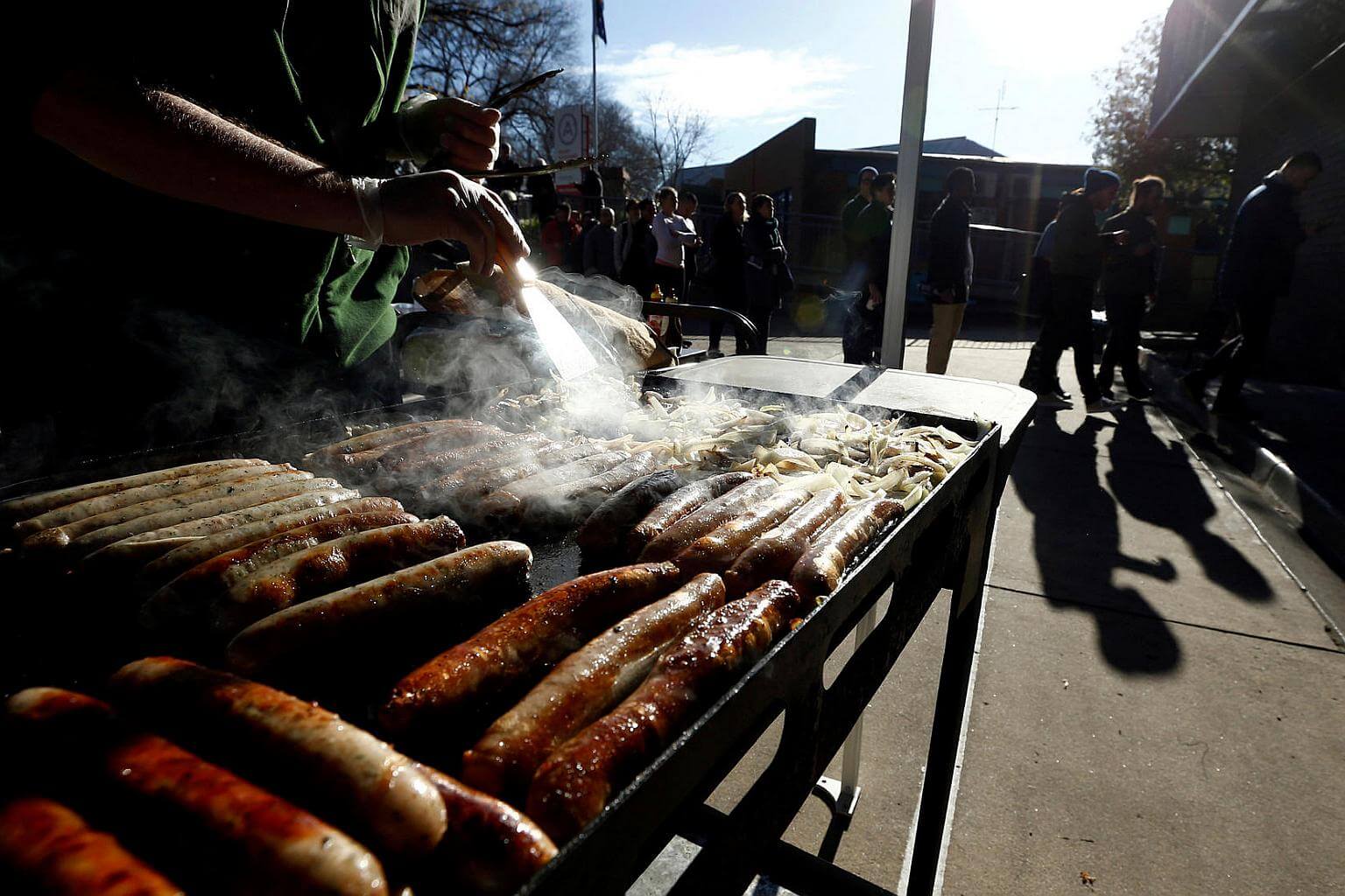 A grill covered in 'democracy sausages' being prepared for voters queuing up at a polling station at Mount Alexander College in Flemington, Melbourne, on July 2, 2016.