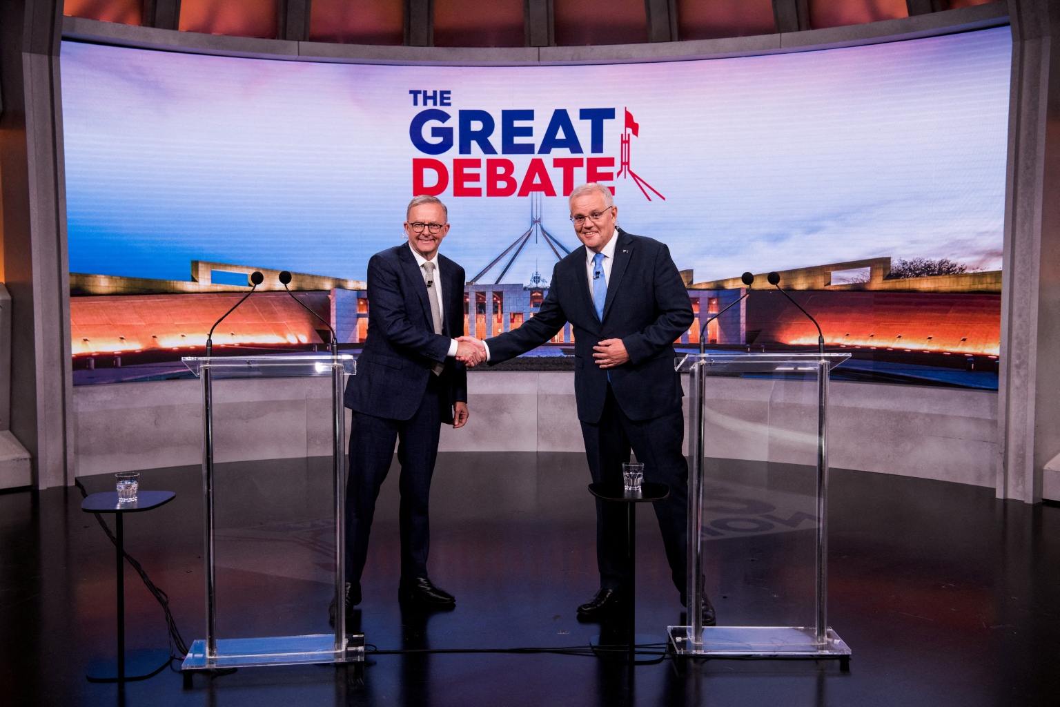Australian PM Scott Morrison (right) and opposition leader Anthony Albanese at the third debate of the 2022 federal election.