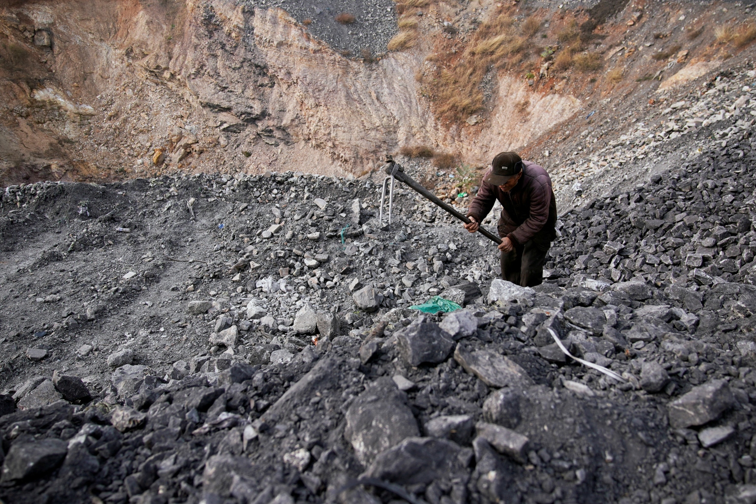 A man sifting through dunes of low-grade coal near a coal mine in Ruzhou in China's Henan province, on Nov 4, 2021.