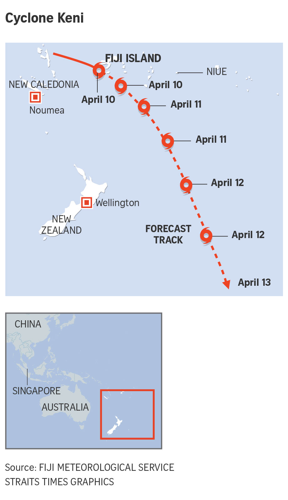SYDNEY (REUTERS) - Fiji was bracing on Tuesday (April 10) for the second potentially destructive cyclone to hit the Pacific island nation in just over a week, with authorities advising residents to prepare survival kits and be ready for evacuation.