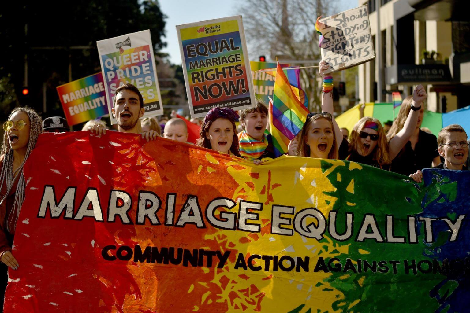 Supporters of marriage equality at a protest march in Sydney on Aug 6, 2017.