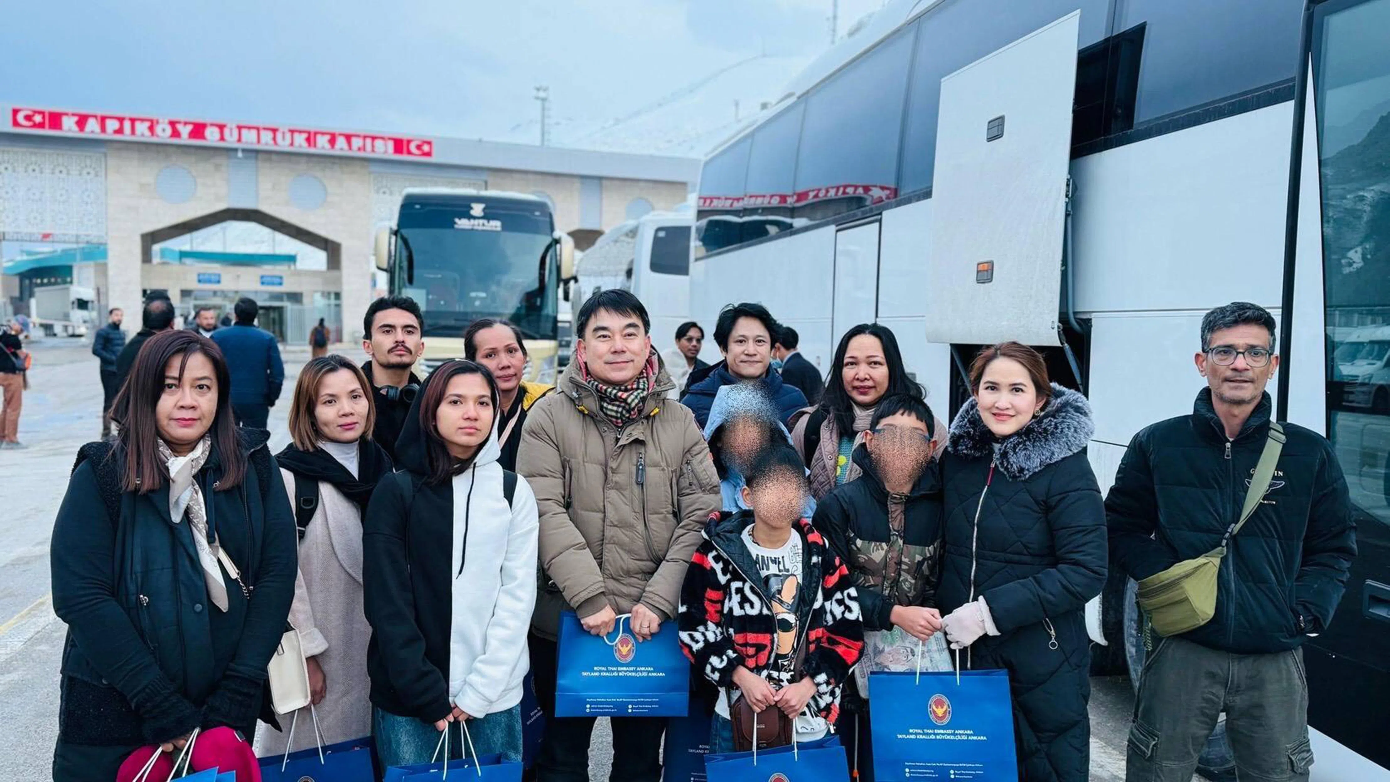The first group of 62 Thais arriving at the Kapıkoy border checkpoint in Turkey from Iran on March 7.