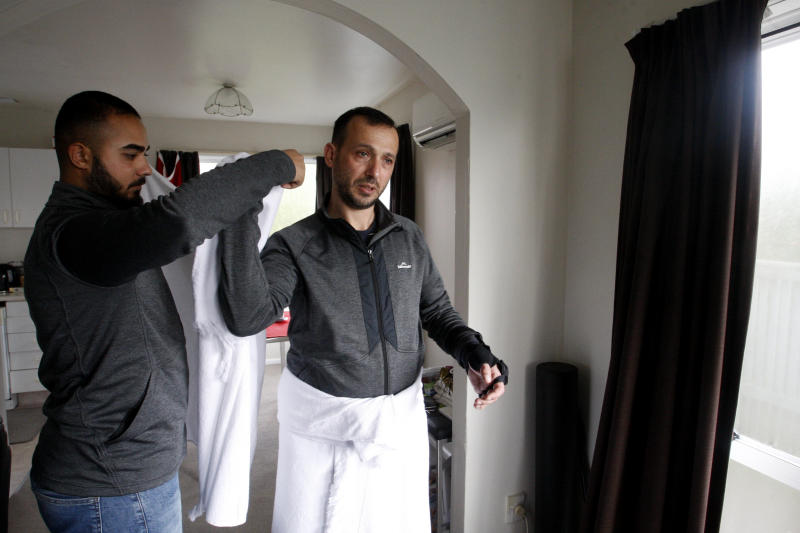 Mr Temel Atacocugu (right), who was shot nine times during the Christchurch mosque attacks, tries on the clothes he will wear during the Haj pilgrimage, in Christchurch, New Zealand.