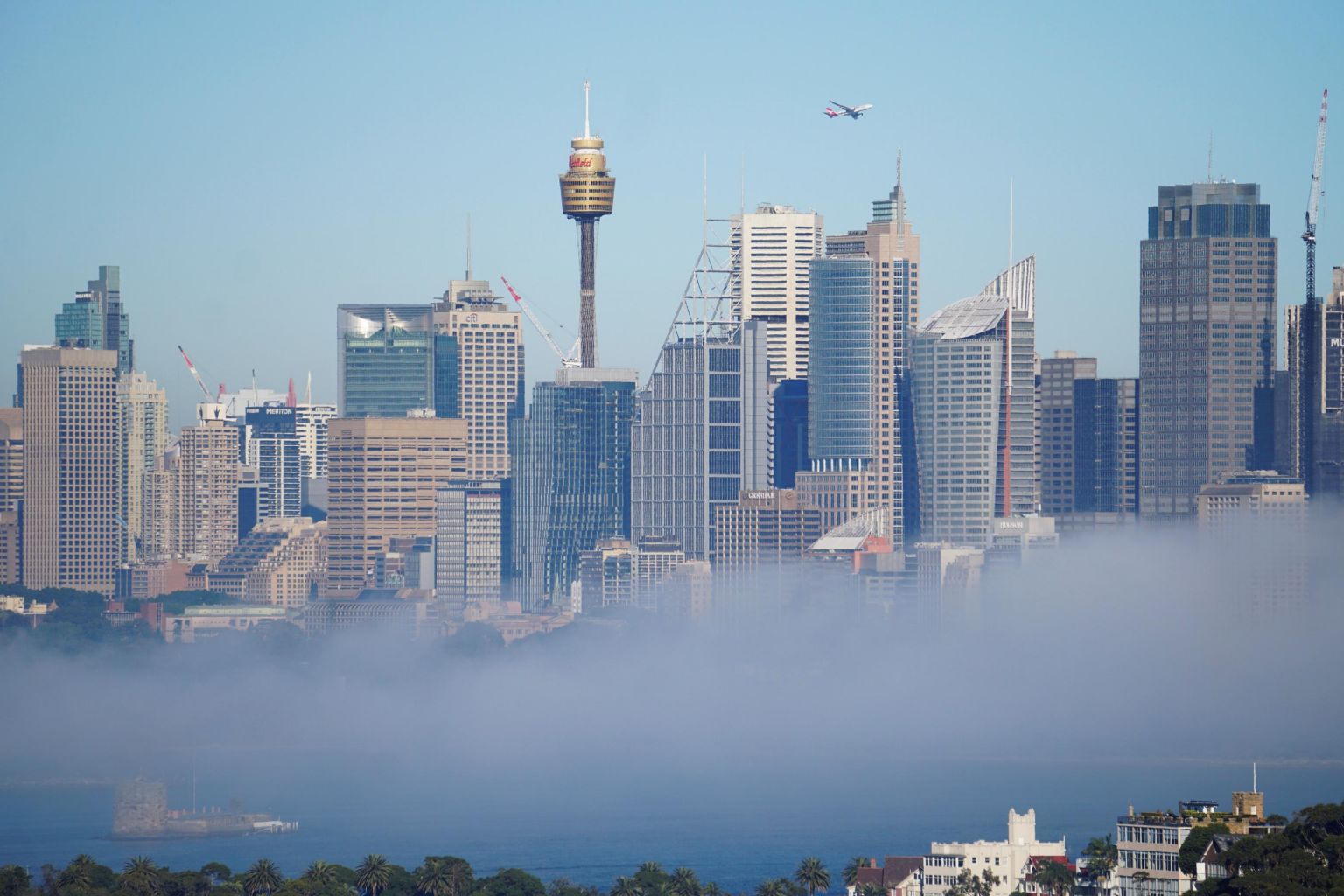 Fog shrouds the city of Sydney as a Qantas plane flies overhead on June 29, 2019. Several flights at Australia's Sydney Airport have been delayed or cancelled due to the fog.