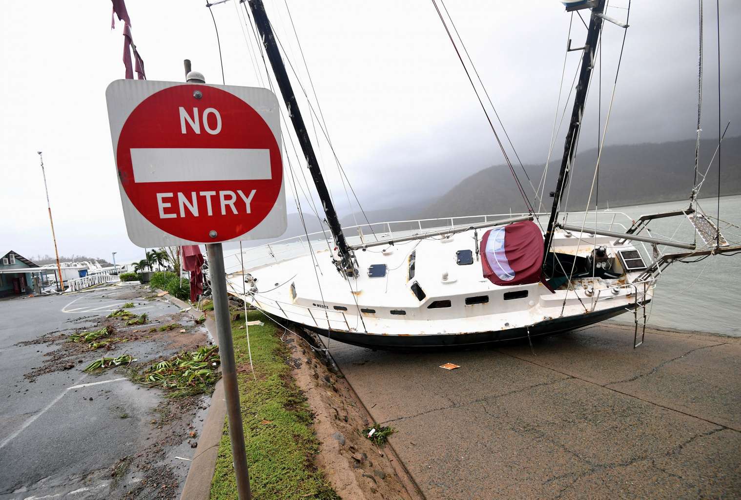 A boat is smashed against the bank at Shute Harbour, Airlie Beach, on March 29, 2017.