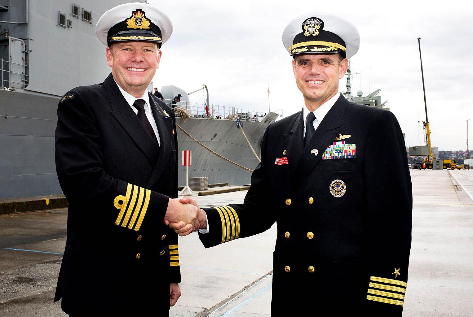 Commander of the Australian Maritime Warfare Centre, Captain Guy Holthouse AO, RAN (L) welcomes Commanding Officer USS Antietam, Captain Michael McCartney (R) to Fleet Base East during a port visit to Sydney before the start of Exercise Talisman Sabre 2015.