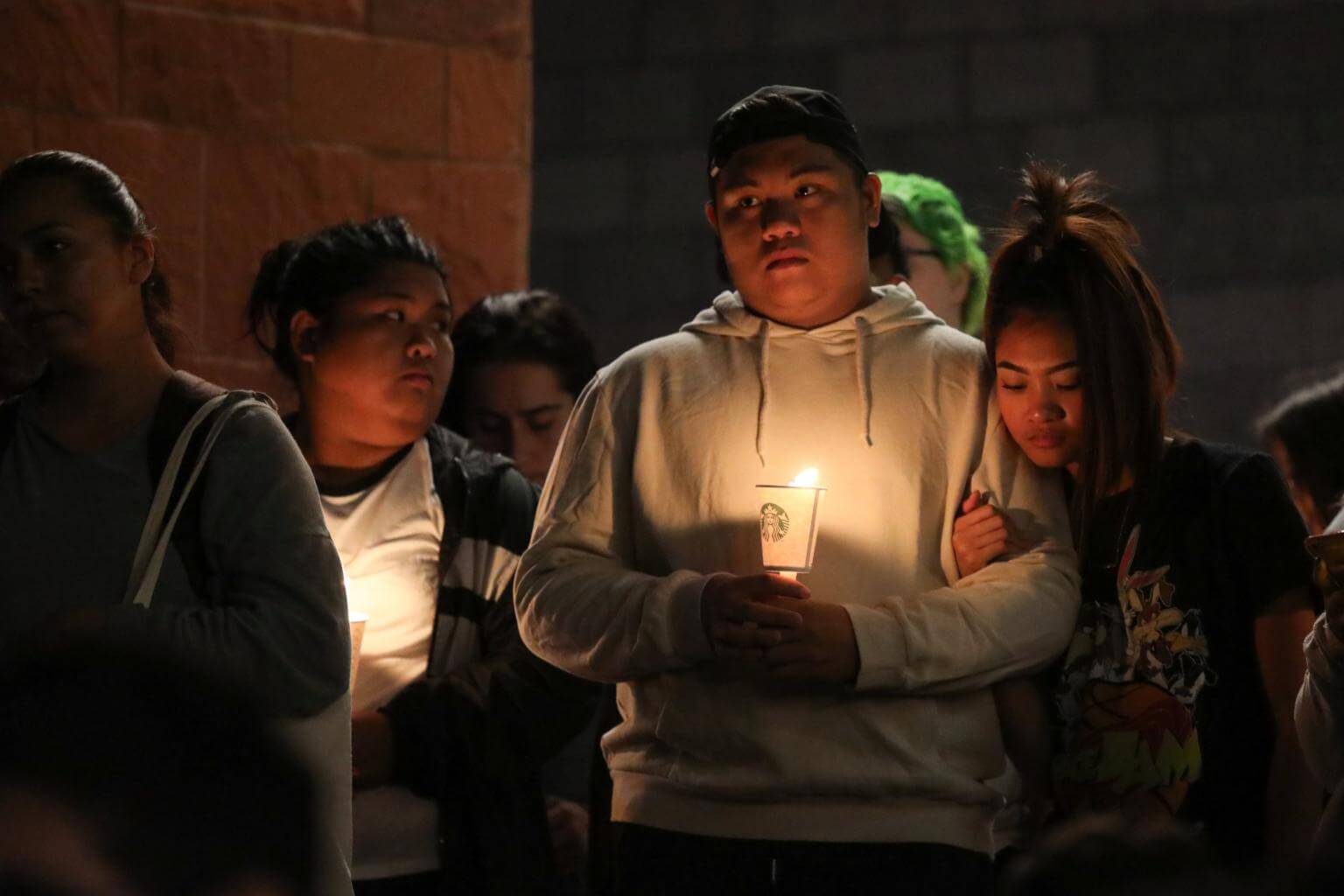 Mourners stand in silence during a candlelight vigil at the University of Nevada Las Vegas (UNLV) for victims of a mass shooting in Las Vegas on Oct 2, 2017.