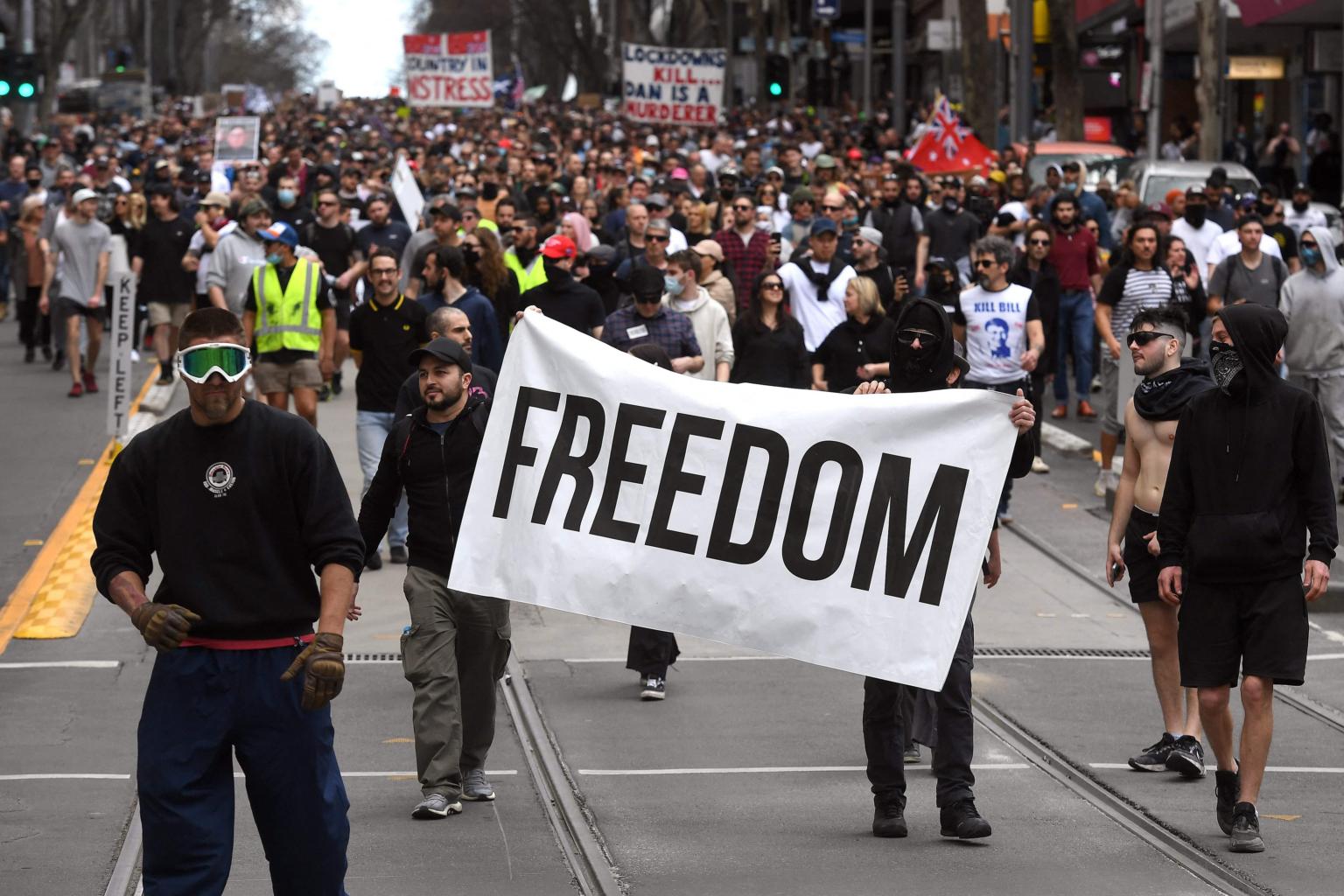 Protesters marching through the streets during an anti-lockdown rally in Melbourne on Aug 21, 2021.