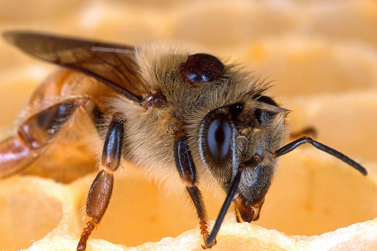 A European honey bee with a varroa mite on its back. The mites cause death and disease in bee colonies.