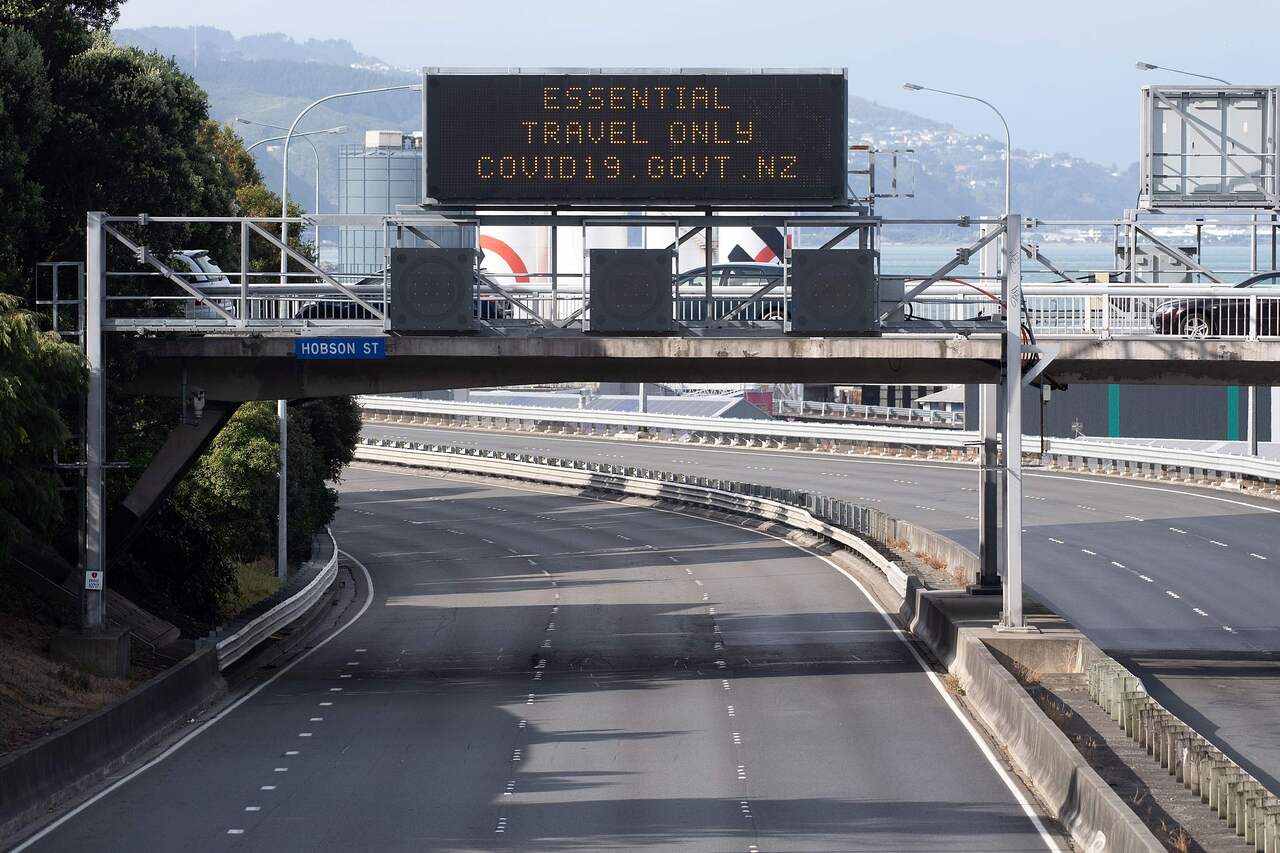 A photo from March 26, 2020, shows motorway signage over the deserted State Highway One in Wellington.