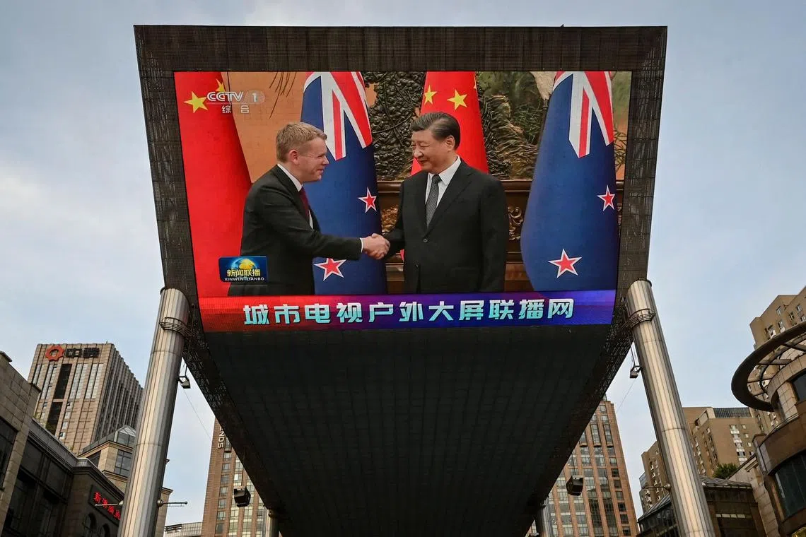 An outdoor screen in Beijing showing footage of New Zealand Prime Minister Chris Hipkins meeting Chinese President Xi Jinping at the Great Hall of the People, on June 27.