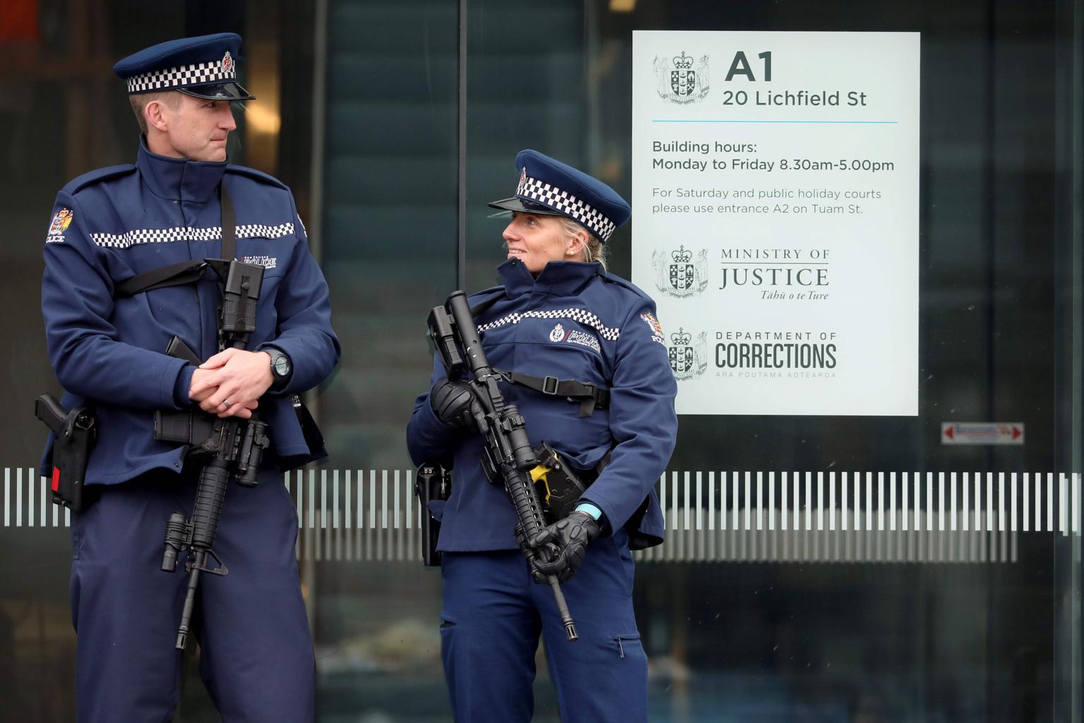 Armed police officers outside the Christchurch District Court as alleged gunman Brenton Tarrant appeared via audio-visual link in Auckland, New Zealand, on April 5, 2019.