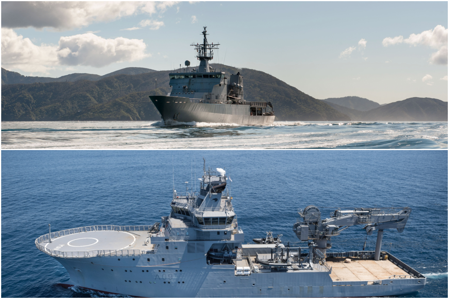 The HMNZS Wellington (top) is an offshore patrol vessel, and the HMNZS Manawanui is a dive and hydrographic ship.
