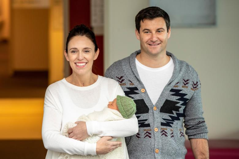 New Zealand Prime Minister Jacinda Ardern (left) holds her newborn baby daughter next to her partner Clarke Gayford in Auckland, New Zealand, on June 24, 2018.