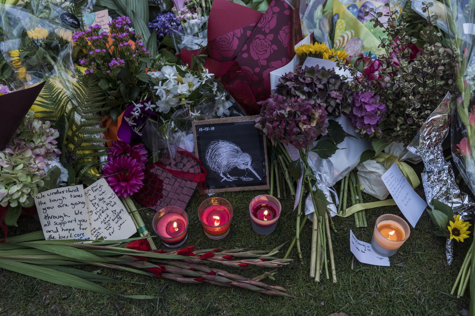 Flowers, candles and letters at a makeshift memorial honoring those killed in the mass shootings at two mosques in Christchurch, New Zealand, on March 17, 2019.