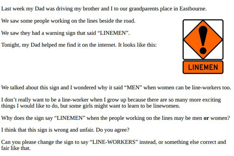 "Why does the sign say 'linemen' when the people working on the lines may be men or women?" she wrote in the letter, which her mother, Caitlin Carew, shared on the social media site Twitter this week.