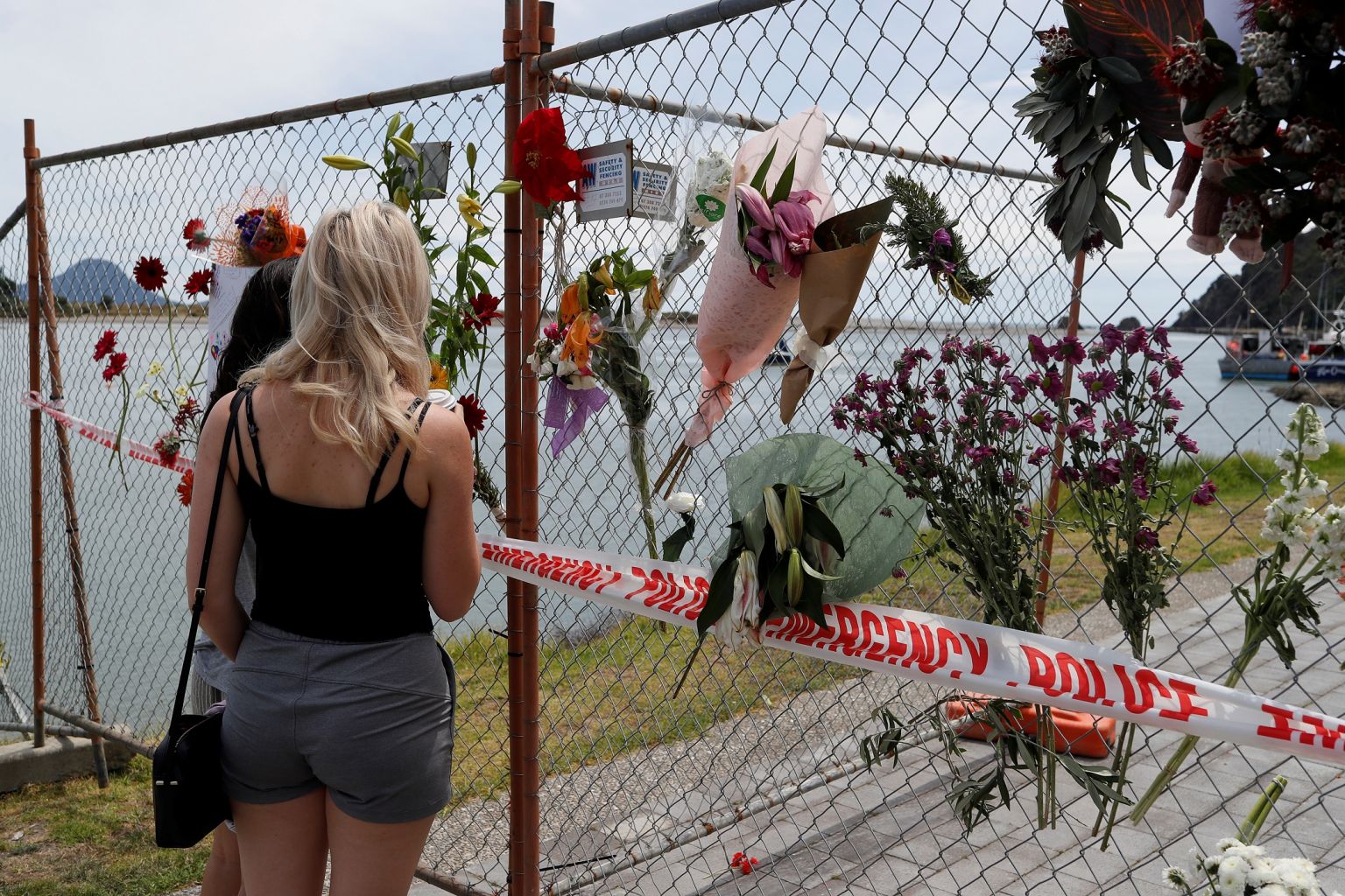 People look at a memorial at the harbour in Whakatane, following the White Island volcano eruption.