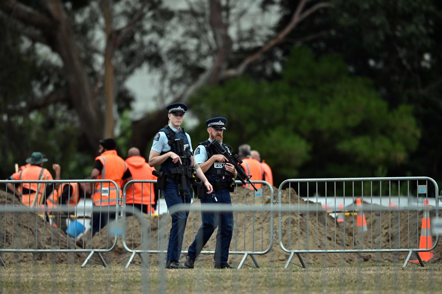 Police patrol a cemetery as workers prepare grave sites for the victims of the Christchurch attacks, early on March 19, 2019.