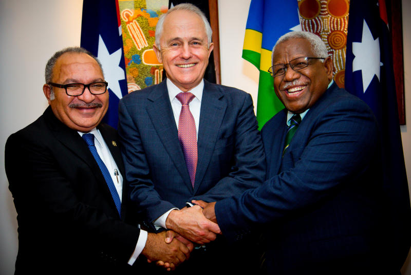 Australian Prime Minister Malcolm Turnbull poses with Papua New Guinea Prime Minister Peter O'Neill and Solomon Islands Prime Minister Rick Houenipwela at the Brisbane Commonwealth Parliamentary Office on July 11, 2018.